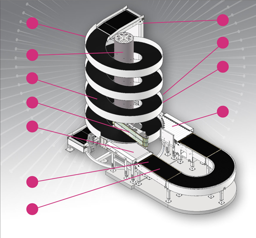 • MDR induction conveyors with friction-coated rollers ensure smooth product transfers into the spiral.
